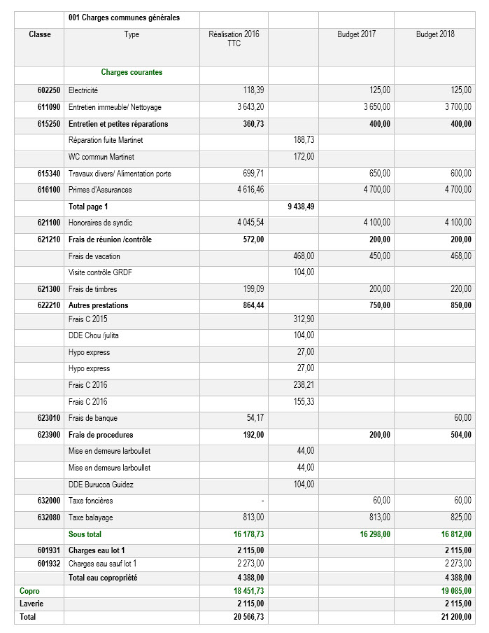 Réalisation 2016 , budget 2017  Budget prévisionnel 2018  réf loi du 10 juillet 1965